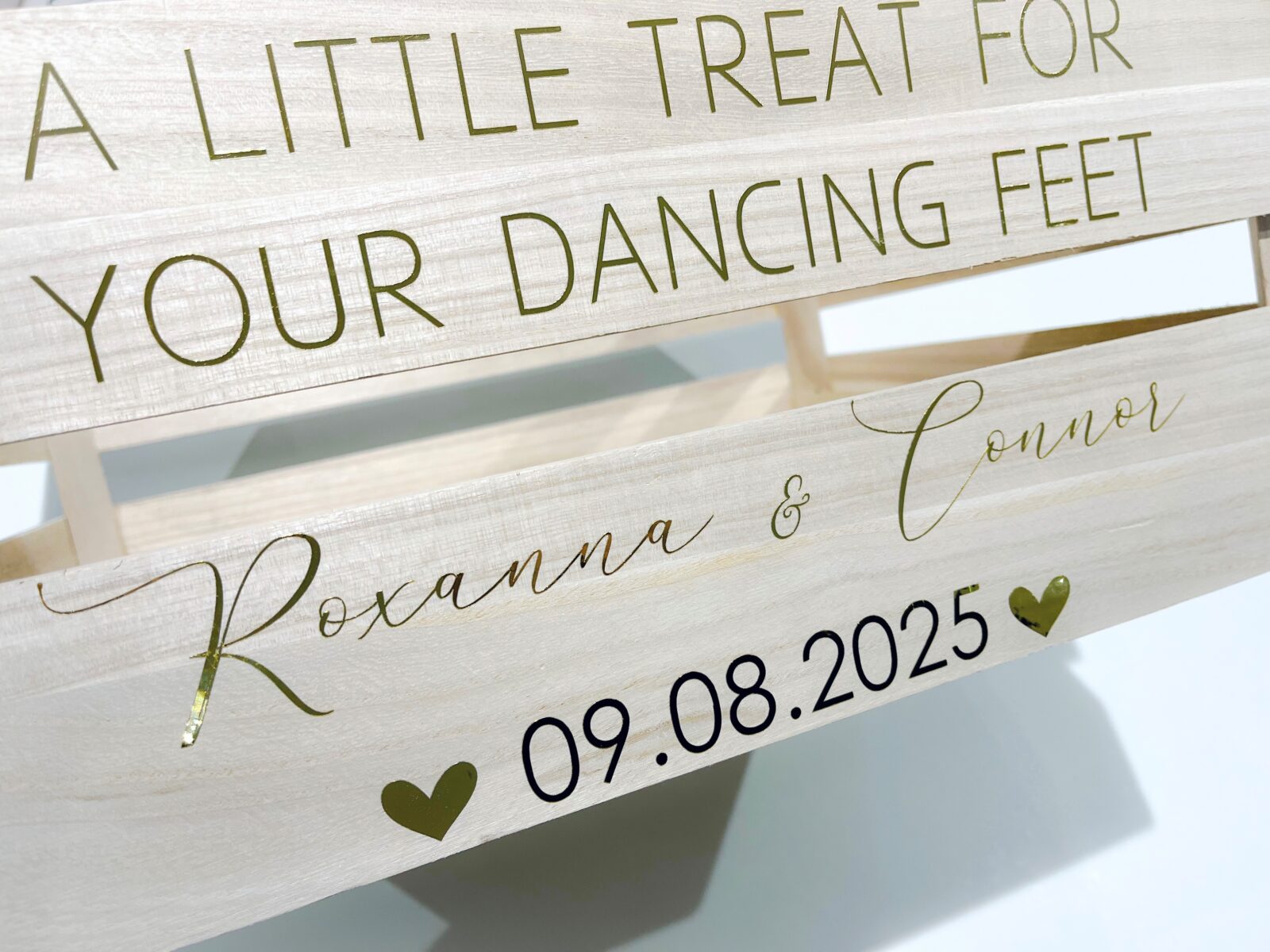 One personalised item that will make your wedding day that extra bit special is one of our personalised flip flop crates. You can personalise the crate by adding your name and wedding date. Our crates all come with a slogan which reads “a little treat for your dancing feet” (and how right that is). The crate can be filled with a range of fun flipflops or soft slippers which allows your guests to attend your evening do in as much comfort as possible.
