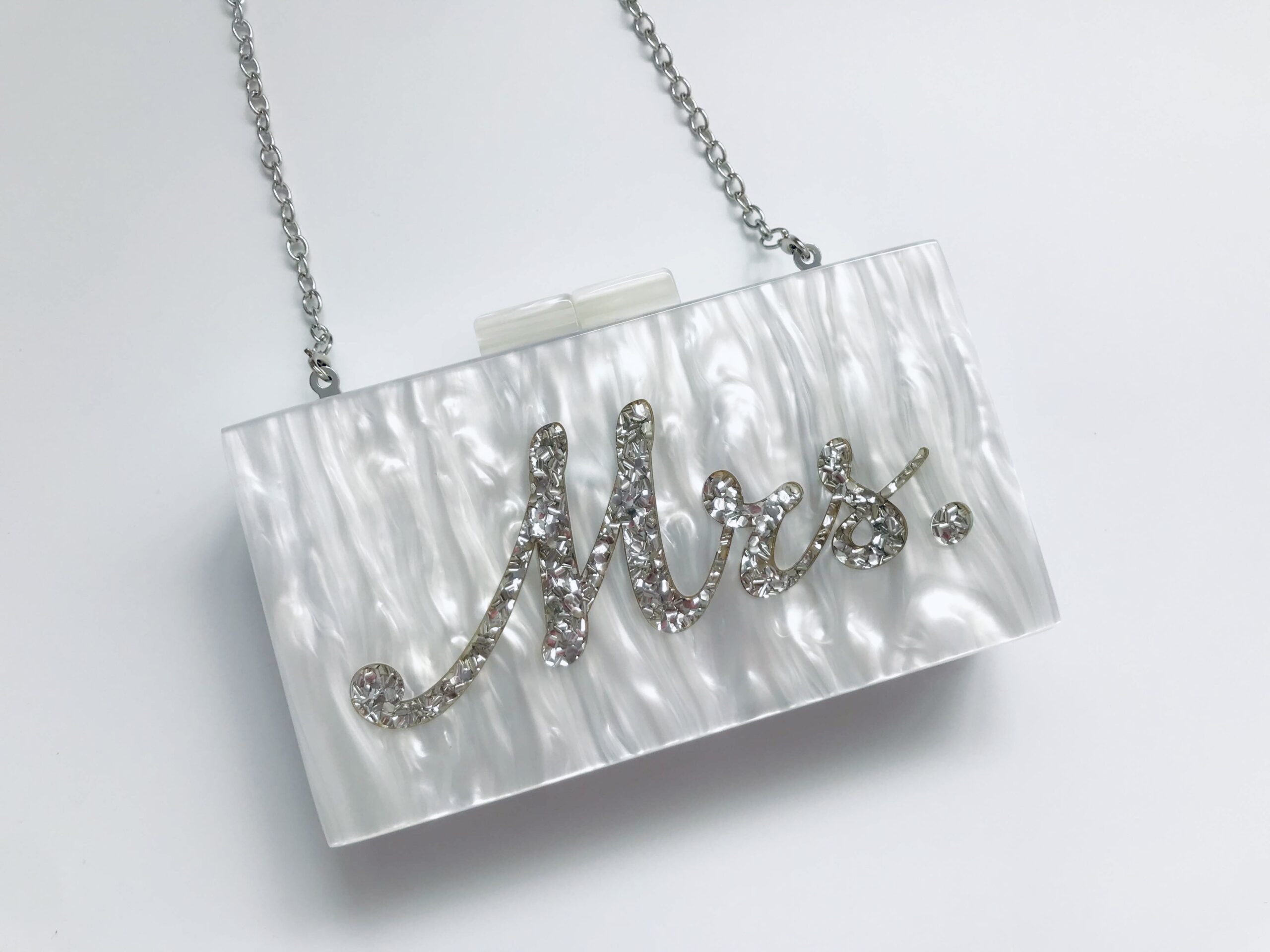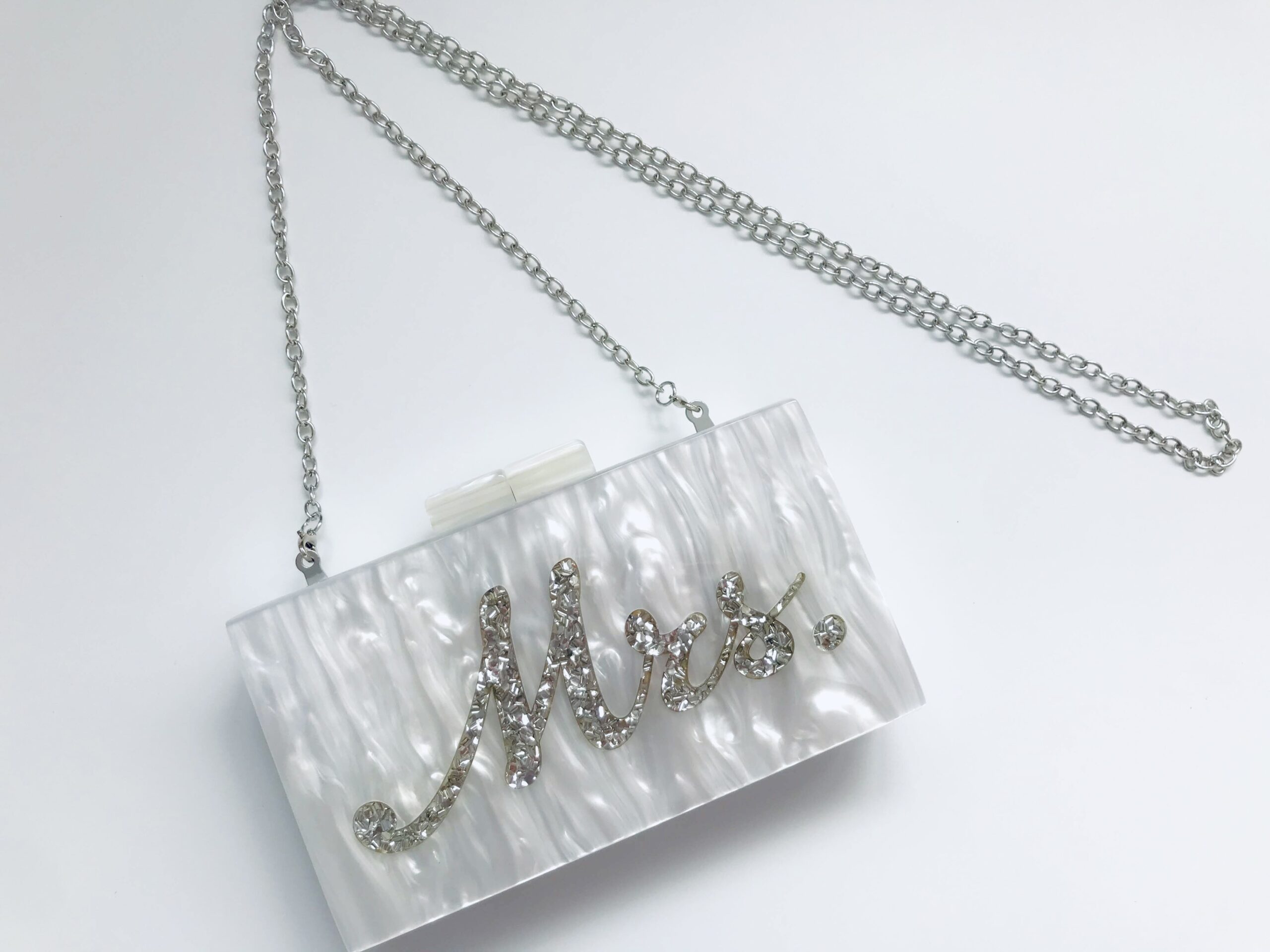 Our Mrs Pearl Clutch Bag is more than just a handbag – it’s a symbol of love, commitment, and your new journey as Mrs. Pair it with your wedding dress or evening outfit for a chic, timeless look.