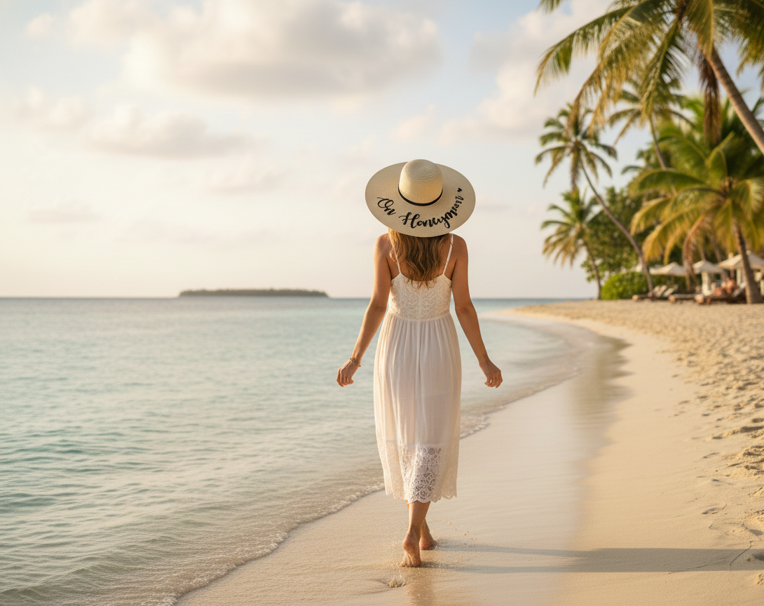 Woman wearing a wide brimmed straw sun hat on her honeymoon, standing on a tropical beach with turquoise water and palm trees in the background