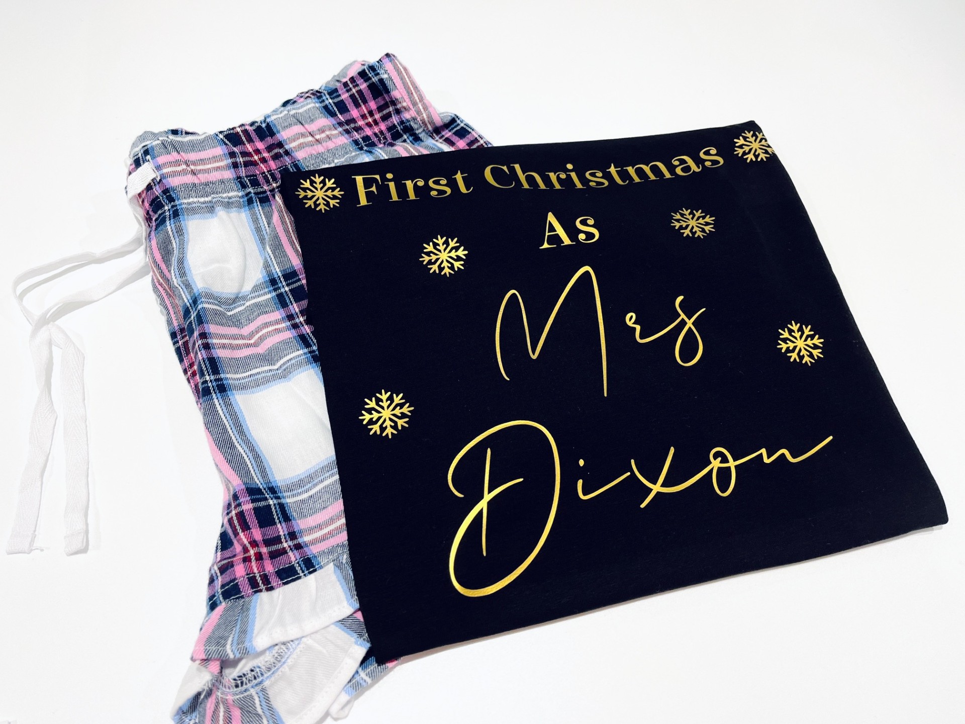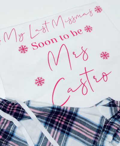 The soft short sleeved top is beautifully personalised with your new married name and festive snowflake details, while the coordinating checked shorts add a fun and relaxed touch. Ideal for warmer nights or those who prefer a lighter festive sleepwear option.