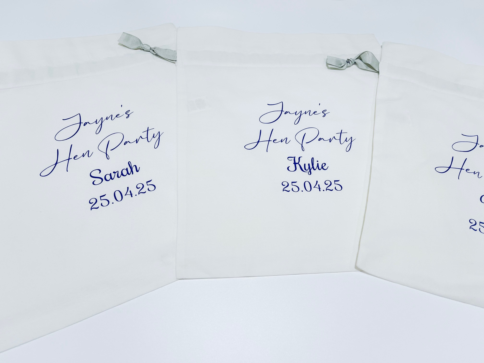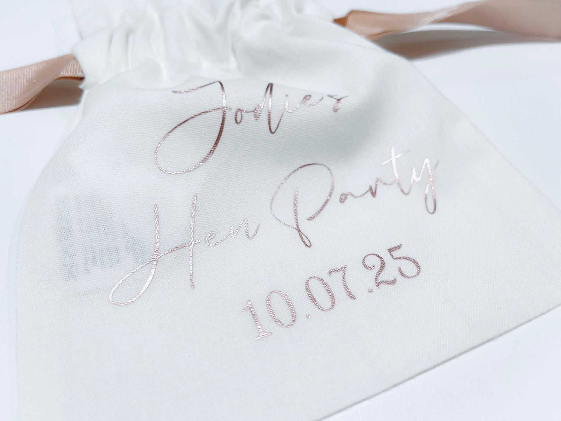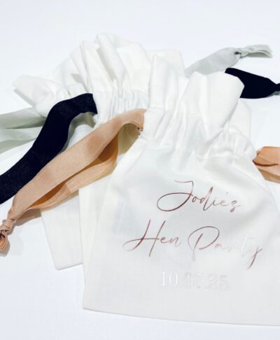 Crafted from luxurious white fabric with a satin finish, each pouch features a personalised design with the bride’s name and event date in gorgeous rose gold lettering, making it an unforgettable accessory for the celebration.
