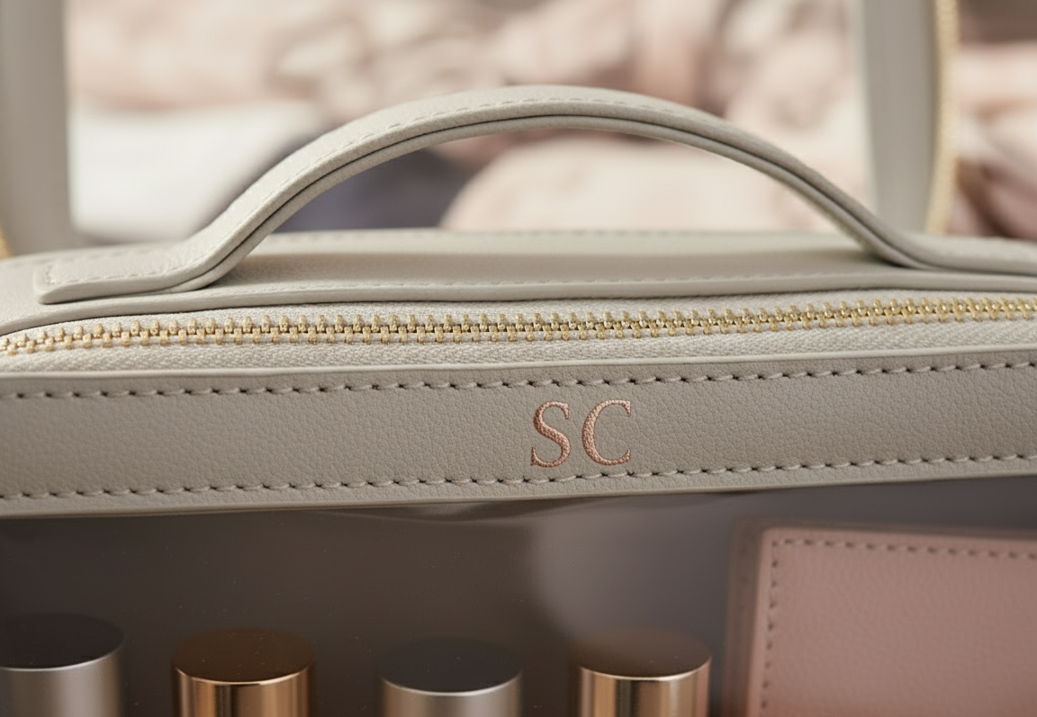 Stay effortlessly organised in style with our Personalised Leather Look Clear Travel Case – the ultimate luxury accessory for weddings, honeymoons, and everyday travel. Designed with a sleek leather-look finish and a transparent window panel, this case makes it easy to see your essentials at a glance while adding a personal touch with custom initials.