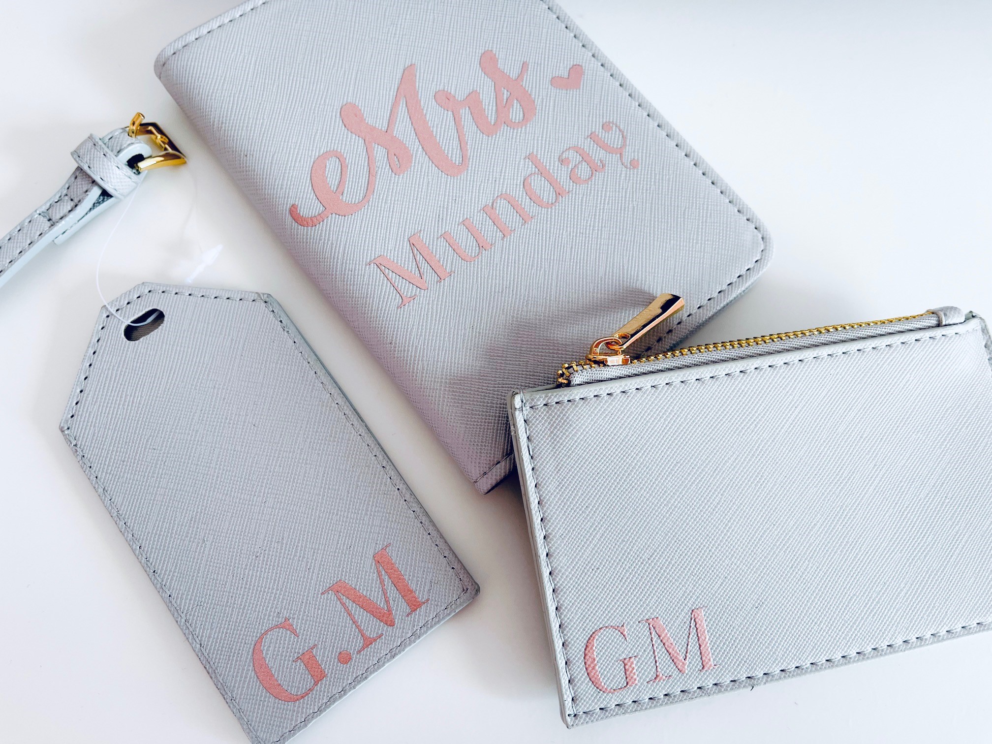 • Close up of matching pink 'Mrs.' and black 'Mr.' passport covers and luggage tags, stylised for a couple on their honeymoon or romantic travel. Mr & Mrs Passport Cover Travel Set £11.99
