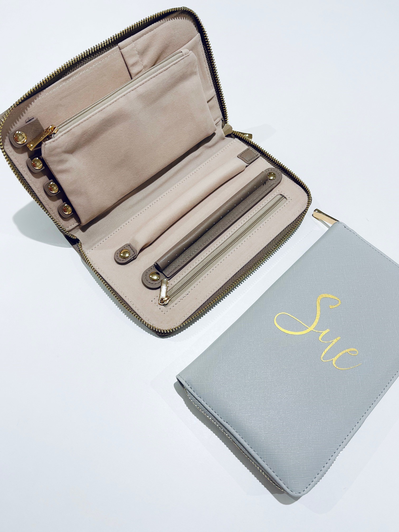Keep your precious pieces safe and stylishly stored with our Personalised Slimline Travel Jewellery Case – the perfect companion for brides on the go. Sleek and compact, this elegant jewellery organiser is ideal for honeymoons, destination weddings, or everyday use, keeping your rings, earrings, and necklaces beautifully protected. Matches perfectly with our travel wallet organiser and passport holder